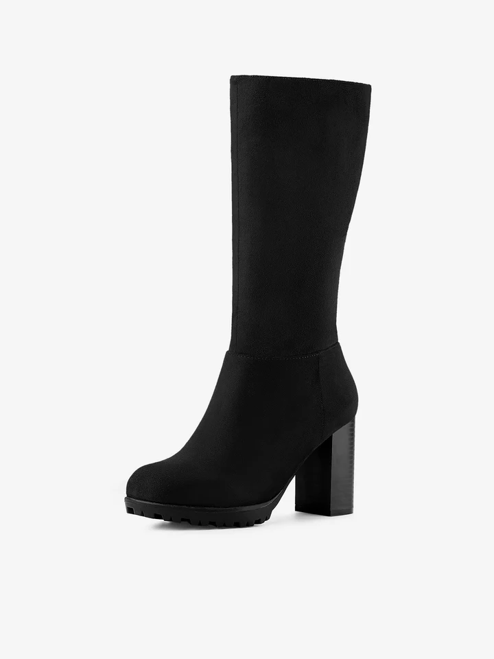 Faux Suede Mid Calf Block Heel Side Zipper Mid Calf Boots